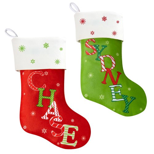 A Personal Creations Exclusive! Eye-catching fleece stockings feature your name, up to 9 characters, in big patterned letters. Please specify red or green cuff. Lined with nylon. Measures 17" L.